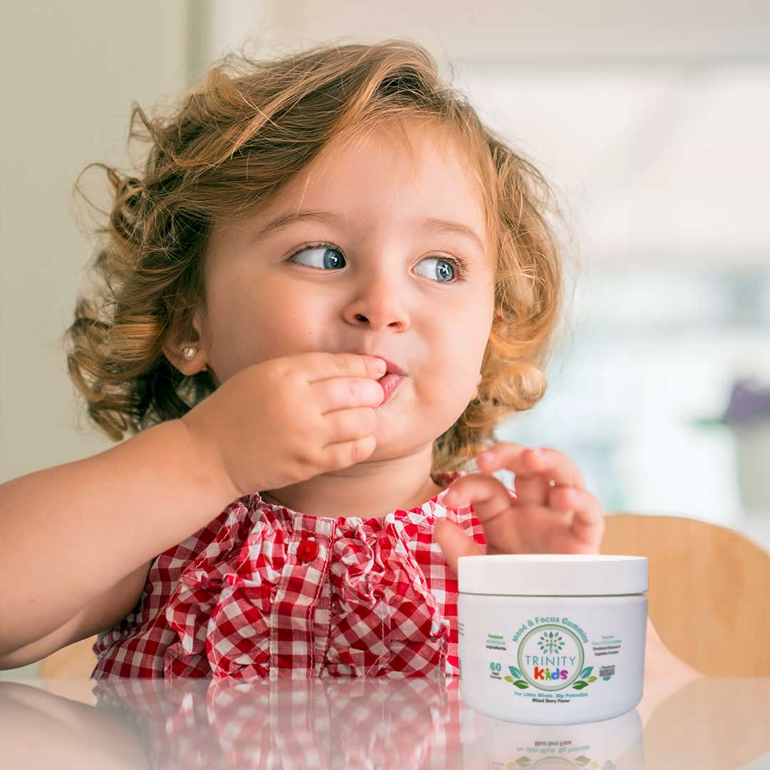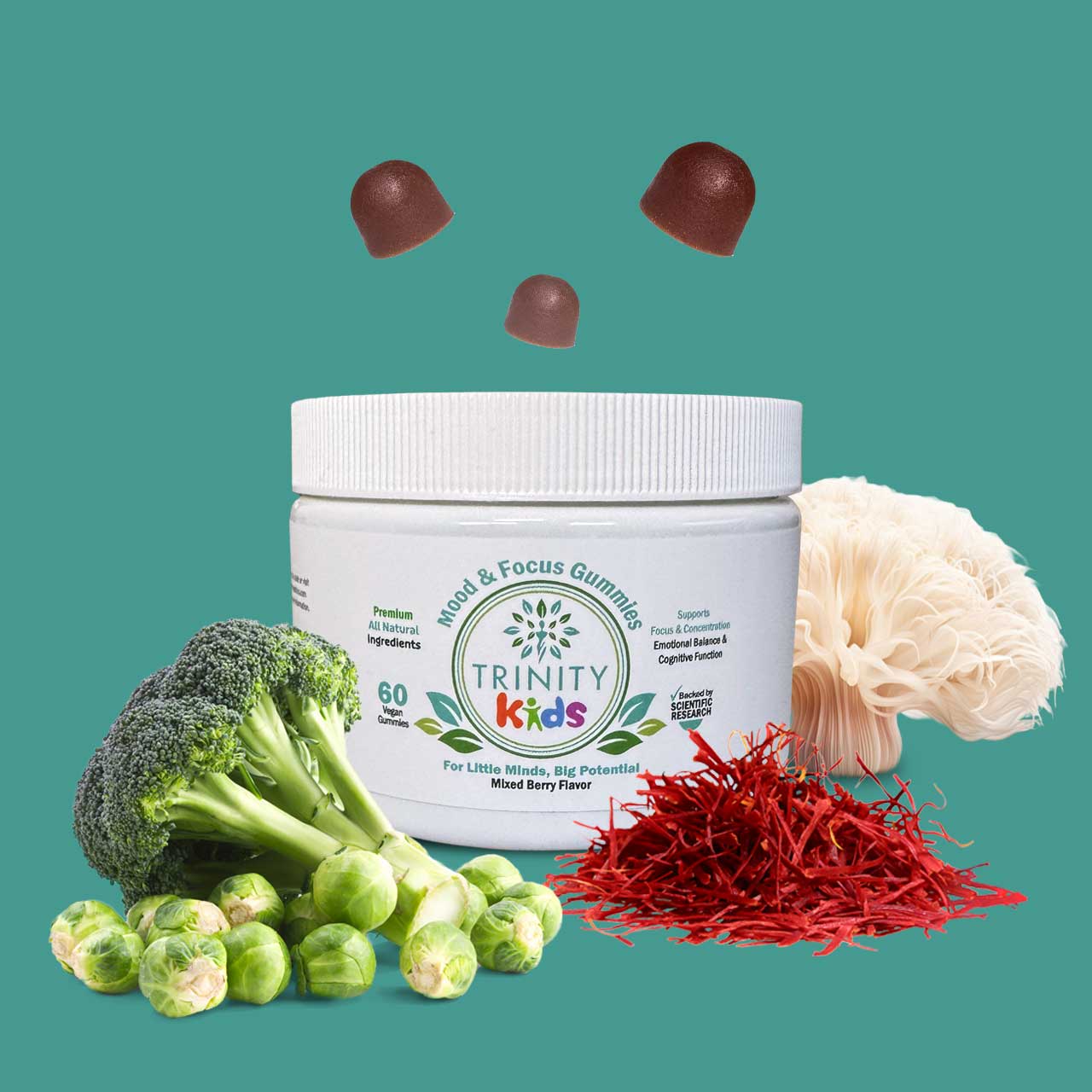 Trinity Kids Mood & Focus Gummies are expertly formulated with clinically studied ingredients to help your child feel more focused, balanced, and emotionally regulated.